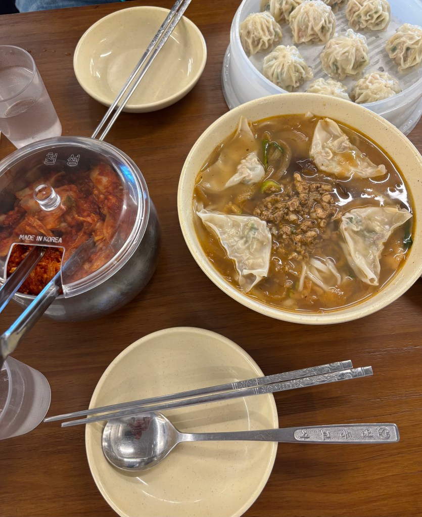 The place was booming, with a line leading in from the outside. They sure know how to shuffle people through, so we were quickly asked how many in our party and told to go upstairs. Once up, we were handed a menu to make our selections and pay before being directed to a small, two person table. The tables come ready with water pitchers and a pot of kimchee. The restaurants in Seoul (like every one we visited) have a handy drawer or drawers built under the table which houses chopsticks, spoons, napkins, and a bottle opener. Genius. It is also common to have a small waste basket next to the table to throw used napkins, as this one did. This was very useful as the tables are quite small and can quickly fill with trash. They are also serving soup and spicy foods which are not only potentially messy but also make the ol’ nose run.
