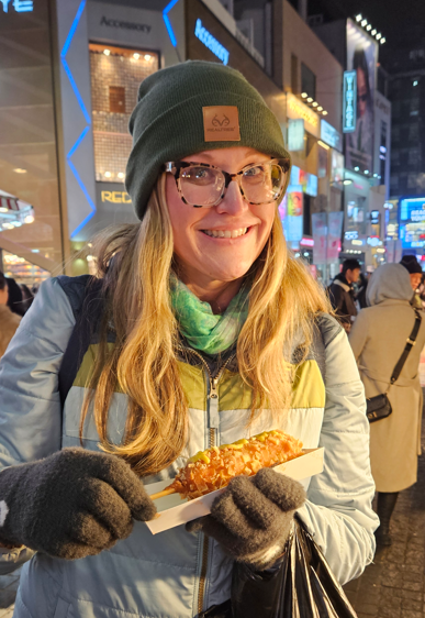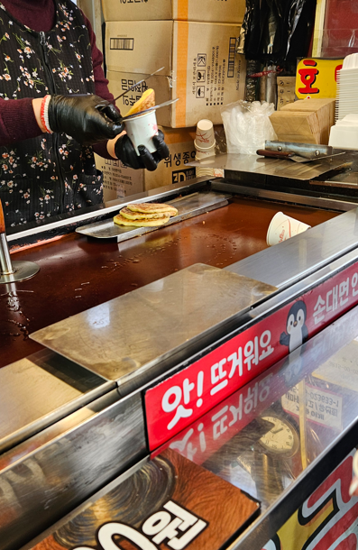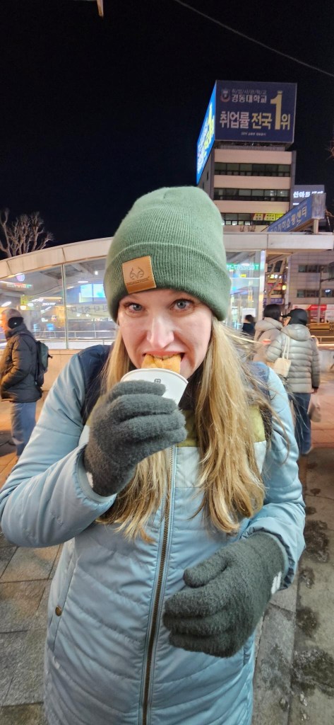 Johnathan dropped us off near the Myeongdong train station and as we walked back, we encountered more street food. I bought another corn dog with potato flakes on the outside and enjoyed a custard and cheese filled coin cake. The batter tasted like taiyaki, the Japanese fish-shaped treat often filled with custard.