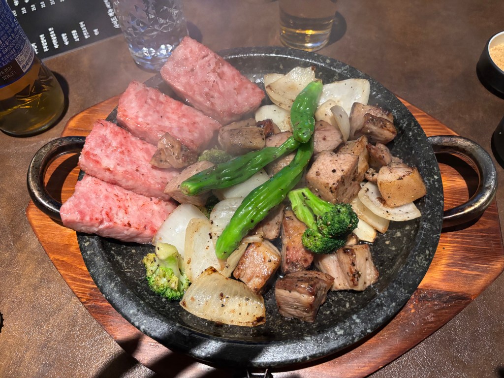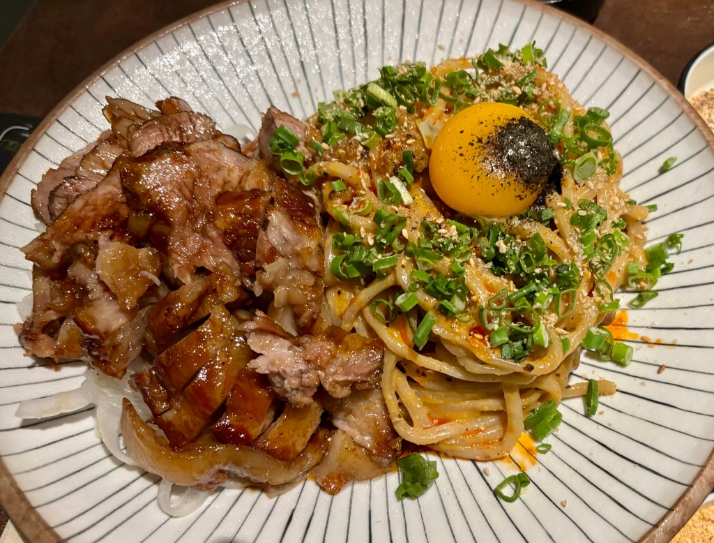 Soon our main course of pork shoulder and house-made spam and assorted veggies was brought out on a sizzling cast iron platter followed shortly by the spiced pork with soybean paste noodles. It was all so good! The cast iron meats were brought out with a BBQ-like sauce and a small bowl of bread crumbs. Our waiter instructed us to dip the pork shoulder in the sauce then the crumbs. It was super good with or without the sauce/crumbs and particularly good with the onions sizzled down in the pork fat. The noodles were a little spicy and also sweet. Always a great combo in my opinion.