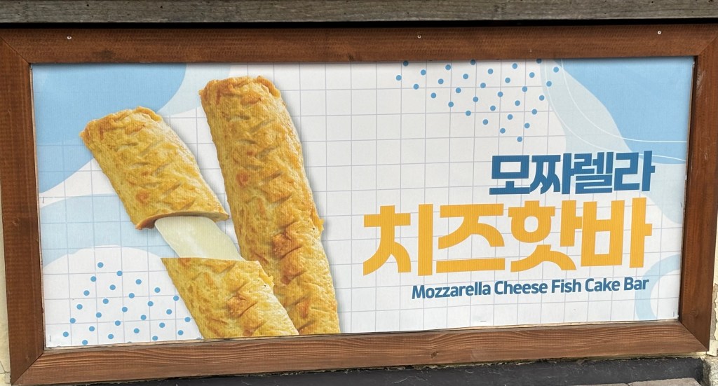 We started with a pancake that housed syrup and a few crunchy sunflower seeds inside followed by what Johnathan called a fish cake (known as eomuk or odeng). I was glad Johnathan suggested we try it. I’d seen them before on the street and in markets, but it looked like wet tripe which did not appeal to me. The fish itself was firm even thought it rests in a broth until sold. He urged us to try an additional cup of the broth as well, which we did. It was fishy and salty and brothy and nice on the cold day.