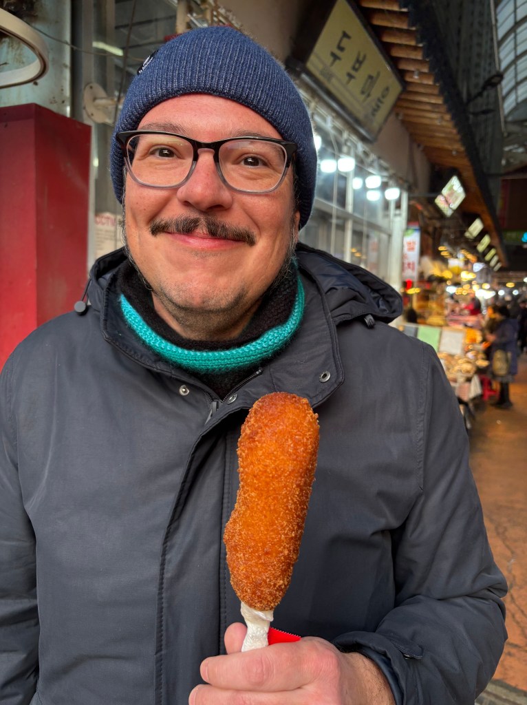 We also had a deeeeelicious donut-like fried pastry with crunchy bits on top, stuffed with red bean paste. Unfortunately, as sometimes happens, I was too excited and ate it before I could take a photo. I had been very neutral on red bean paste, kind of a take it or leave it attitude, but this donut may have changed my mind. It was pretty fantastic. Phil had a corn dog that was so tasty. It looked like a corn dog but weren’t entirely sure what was going to be inside. It was, in fact, a corn dog and really good with a slightly sweet, funnel cake like, crunchy batter. I love the photo of him grinning ear to ear with it.