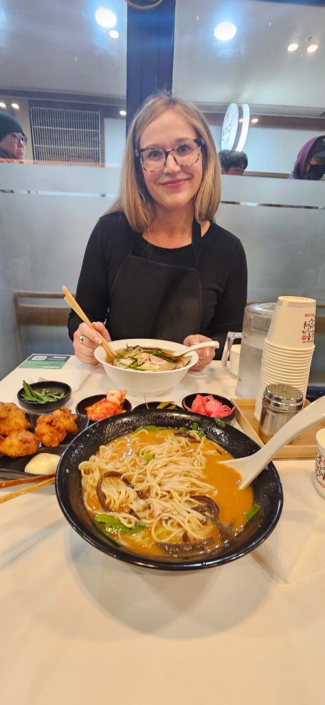 Our second full day in Seoul, we had a 1:30 tour scheduled; we slept in a little, especially compared with our early rise the day before. Did I mentioned it was cold in Seoul? It was. It even snowed a little bit overnight. We carefully made our way to a nearby lunch spot, avoiding ice and slush as much as we could, that we’d saved on our maps app to have a bite before the tour.