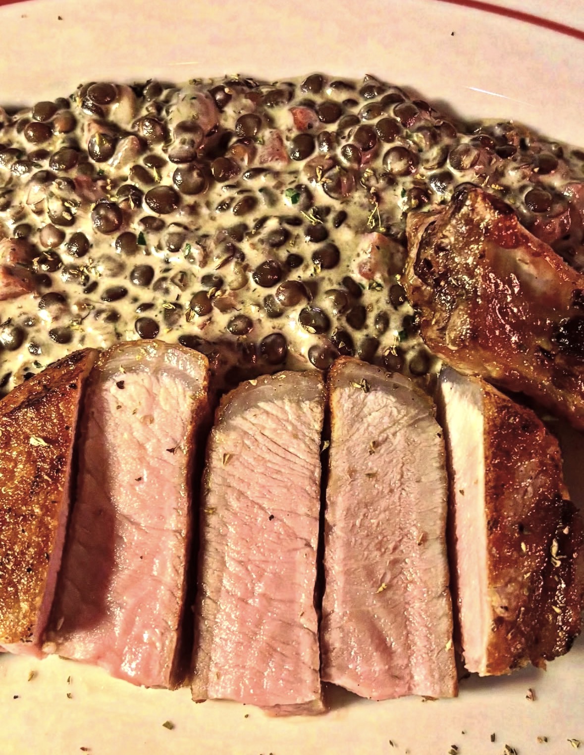 Alfonso has lived in many different places around the world, including the U.S. When we told him we’d lived in Asturias, he asked, “Why Asturias? That’s like moving to the U.S. and living in Wisconsin”. He was a real character and we enjoyed chatting with him a bit between courses. When we were ready to order our entrees, we told him we wanted to ask Panos some questions about the menu. He seemed offended and told us, “This is my menu, ask me anything”, and so we told him we wanted the moussaka, a favorite of Phil’s, and I was considering the braised beef cheeks. He told us the beef cheeks were not very Greek, more Mediterranean and if we wanted traditionally Greek food, better to go with the pork chop and lentils. I love a good pork chop and am neutral on lentils, so we took his recommendation and ordered one of each.
