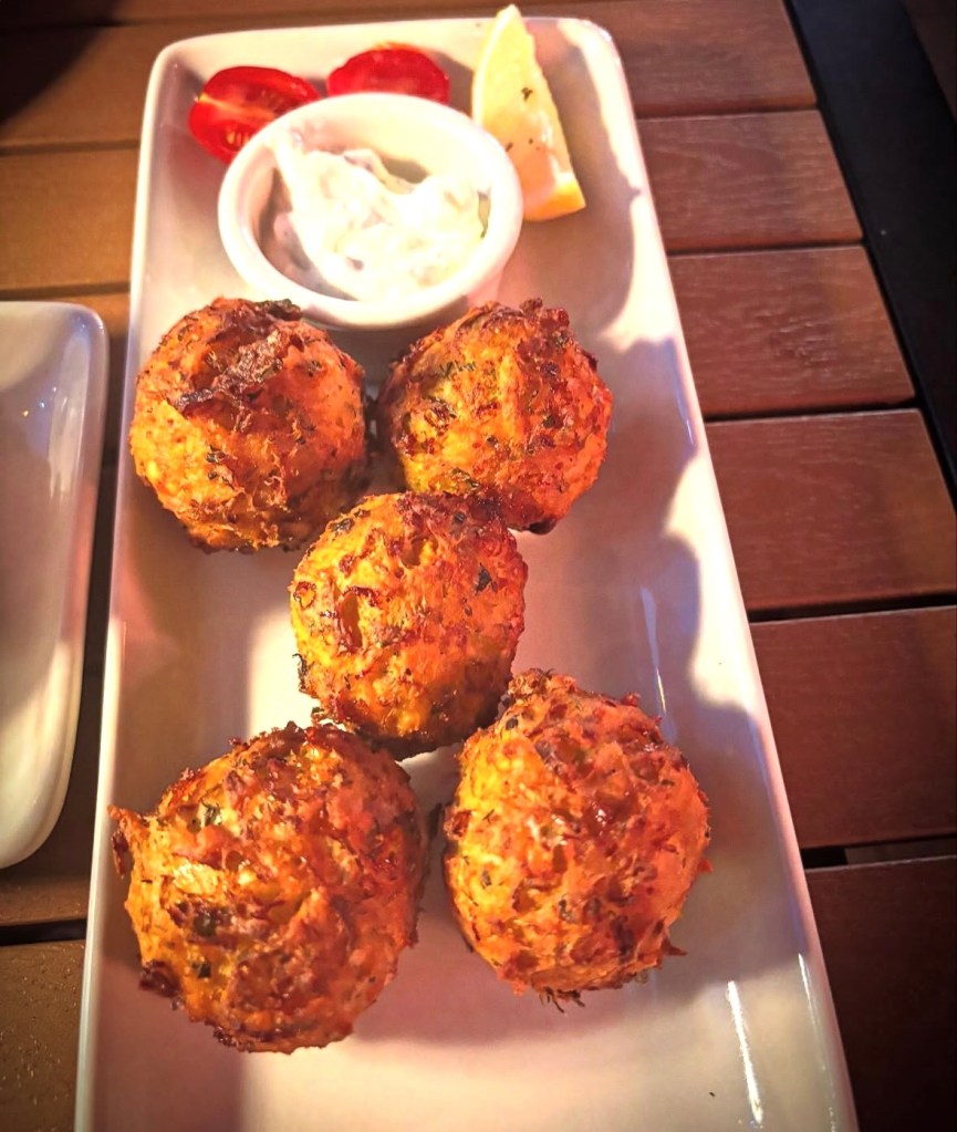 We started with meze plates of taramasalata (white cod fish roe whipped with lemon) served with warm pita bread and kolokithokeftedes (pumpkin fritters made with feta and herbs) served with tzatziki. It was all delicious and Panos brought us another white wine to try.The second white tasted a bit more like a chardonnay (though it was a Greek wine) and the first a bit lighter and crisper. Both were quite nice.
