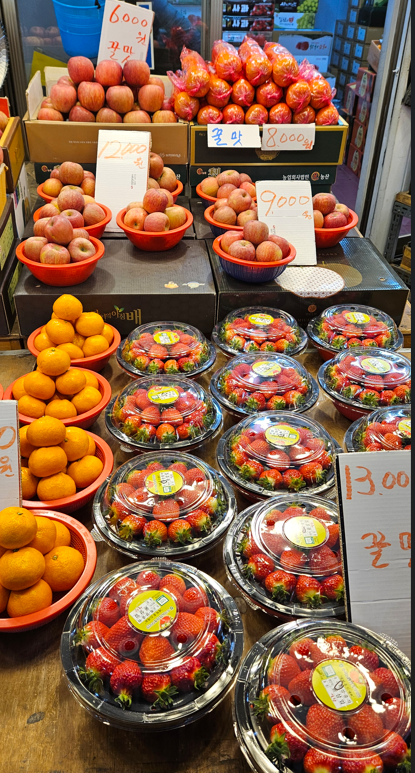 The last stop on our trip was Suwon Nanmun Market. It was a real twofer since Johnathan’s wife had instructed him to pick up dinner from the market and it gave us a chance to peruse while he did. It was bustling and had all kinds of meat, seafood, fruit, veg, and prepared goodies for sale.