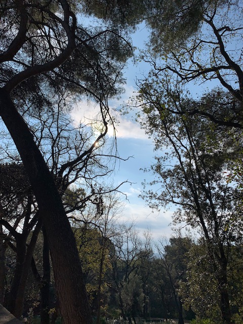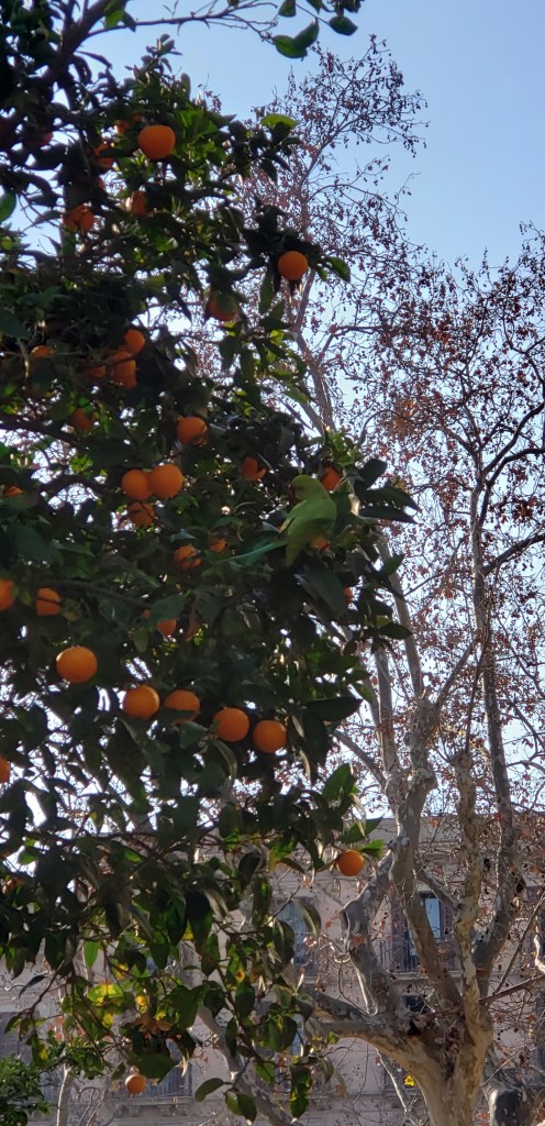 Leaving the harbor, we crossed the street to Parc de la Ciutadella, a large and lovely green space in the city. As we were glancing up into the trees, we saw the largest birds nests we have ever seen. We heard the loud, almost screeching of birds. I didn’t know why but the sound seemed familiar. We walked a few more feet and saw bright green parrots high up in the trees, working on their nests. Next to their tall nesting tree, a tangerine tree was conveniently located. Several of the birds fluttered about, snacking on the citrus fruit. When we lived in Long Beach, a band of rouge, feral parrots famously inhabited the neighborhood of Belmont Shore, near our apartment. The parrots were rumored to have escaped from a pet-shop in Pasadena in the 1980’s. I knew the parrot shrieks sounded familiar!