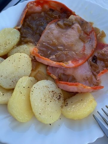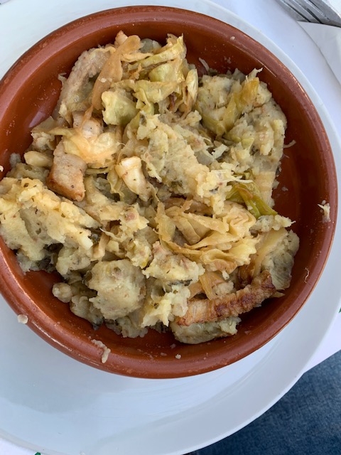 After we left the park, we decided it was time for lunch. We happened by Bracafe which has been around since 1929 and figured there must be a reason for that so sat down at one of their outdoor tables in the sun and ordered the menu del dia. For the first course we had a salad of goat cheese and caramelized onion and a dish with bacon and cabbage that had a delicious spice mix that we couldn’t quite place. Second course was baked chicken and potatoes for me and pork loin and potatoes for Phil. We finished the meal with pistachio gelato and chocolate cake with a nice coffee, of course.