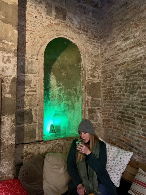 The two empanadas were delicious and we resisted the urge to buy two more, trying to save room for tapas at El Jardi. We arrived at El Jardi just as they were opening and were the first customers of the night. We picked a seat in a small, tented area with heaters and pillows that was quite cozy, and ordered a couple of Moscow Mules and enjoyed patatas bravas with a particularly spicy sauce and beef carpaccio.