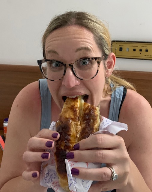 Some of our favortie dishes in addition to döner kebab are stuffed grape leaves (they call then vine leaves in English here), içli köfte (a stuffed, fried meatball), lahmacun (often referred to as Turkish pizza) which is a crispy flat bread with spices and minced vegtables and/or meat, pide (which actually tasts more like pizza than lahmacun) that’s a flat bread (thicker than lahmacun), covered in meat, cheese, or a mix of the two. We also found some tasty treats at the nearby bakery in Antayla including a delicious beef and onion stuffed flaky pasty (see excited photo below). One of the most surprising dishes we had was what the waiter described as “Turkish macaroni”. It was not something I would typically order but he urged us to so we did. It tasted a lot like toasted ravioli (if you’re from or have been to St. Louis, Missouri, you are very familiar with this) which is essentially deep fried pasta, then covered in a tomato sauce and yogurt. It was pretty good.