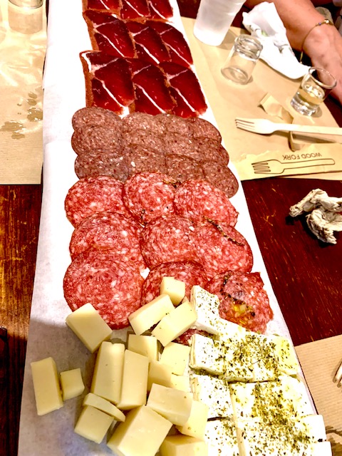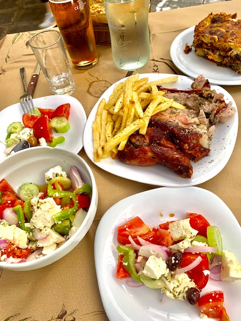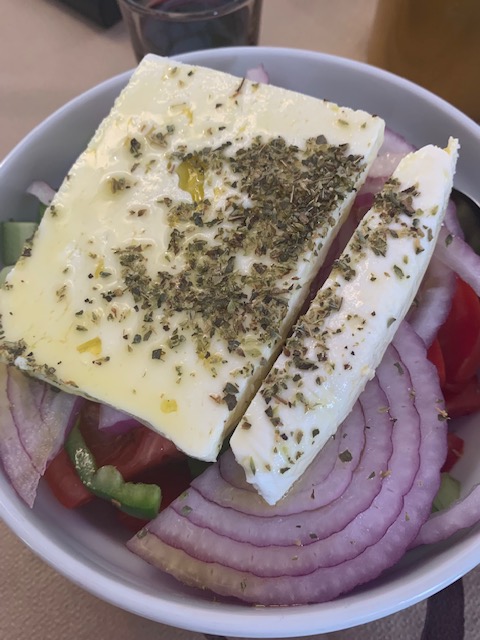 After the olives, we stopped at a quaint local restaurant where we sat in the small back room and Julia made us simple, homemade tzatziki: full fat Greek yogurt, red wine vinegar, garlic and olive oil. We ate it atop a grilled Greek bread called lathobrekto that is a bit like a thick, square crostini with a distinct olive oil flavor. We also tried local red and white table wines that one could commonly find in Greek homes. The restaurant served us a generous charcuterie board of cured meats: pork and lamb salami along with a dried beef that is coated in spices and then air dried called bastruma or pastrima (a cousin of pastrami that is neither cooked or smoked). It’s distinctly bright red, hard casing looks a bit like wax but is not and really packs in the flavor. We also had feta and graviera (Greek gruyère) and learned that true feta can only be of Greek origin and made with at least 70% sheeps milk and can have up to 30% goat’s milk), otherwise it is not feta. It can be called feta-style or Greek-style cheese but true feta meets the origin and milk criteria (and a few others) set by the EU after Greece petitioned them to do so.