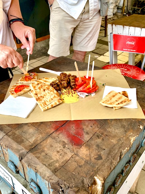 After the restaurant, we were off to eat a bit more. Por qué no (wait, that’s not Greek)? We stopped at the local meat market. Before heading in, Julia and George ordered up souvlaki makings. Julia showed us what she considers a perfect bite of food; a small pita triangle, the ground souvlaki meat dipped in a mustard sauce, topped with onion and tomato. She made two perfect bites and customarily, just like her grandmother used to, served them to the [two] men in the group (they’d be unable to do it themselves, she said) and then the gals were free to make up our own bites. They were delicious though pretty dang big bites.