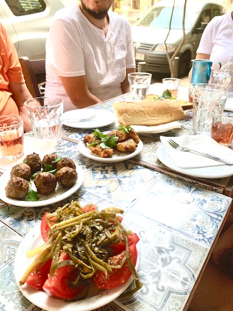 After the distillery, we were off to eat more food. The booze did help to counter balance the extreme fullness I had been feeling so I was up for tasting a bit more. We went to a tiny, unassuming little restaurant and all sat together outside. The owner, from a small Greek island, uses fresh local produce to make different menu offerings daily, using his mother’s old recipes. On the day we visited, he offered us meza (small plates similar to Spanish tapas) of meatballs, zucchini fritters, fresh tomatoes with seaweed, and more tzatziki and lathobrekto bread and served with small glasses of rosé. Julia and George left to meet their next tour and we all sat and chatted for a bit. The owner of the restaurant came out and gave us and himself all a shot of Tsipouro, a grape distilled spirit very similar to raki. After taking mine, I looked at Phil and gave him the look of, “that was surprisingly smooth”, to which the owner responded by giving me, and only me, another shot. When in Greece I suppose.