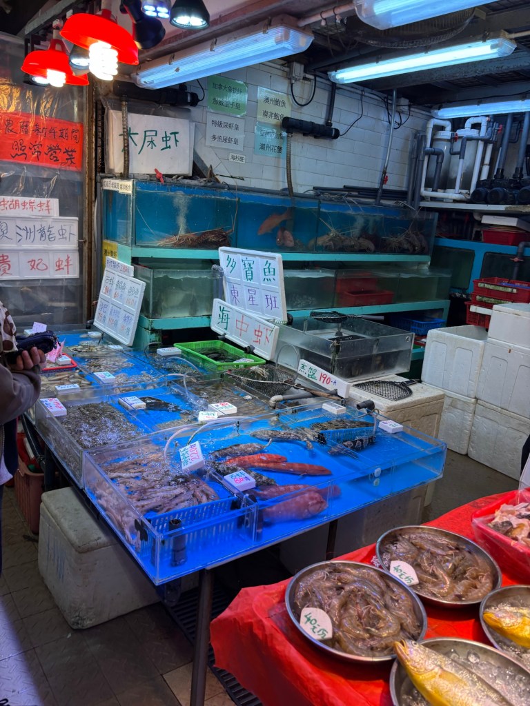 We stopped briefly near one of the seafood vendors. Steven said that because people in Hong Kong want the freshest seafood possible, they usually buy it live, and kill it right before preparing it to ensure the purest flavor. We observed many tanks of all manner of live seafood. He said many times, people will purchase their seafood on the second floor, then walk up to the third and give it to a food stall who will prepare it for a fee, which ensures a very fresh and delicious meal.