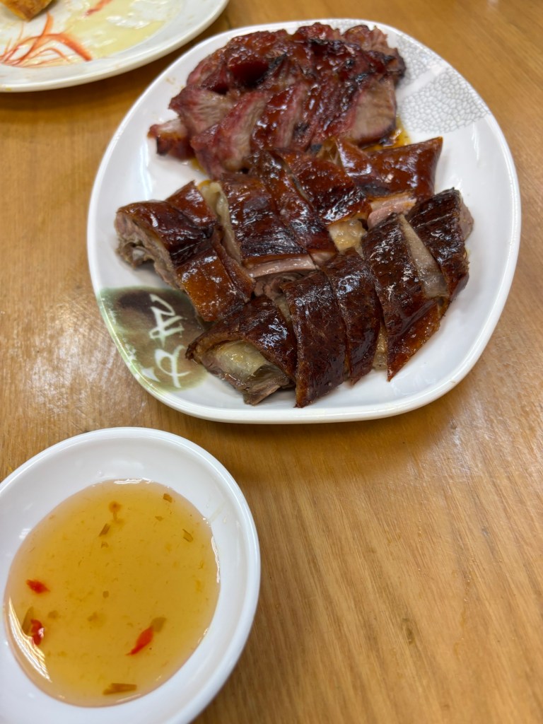 We took the escalator to the 3rd floor where we first enjoyed Hong Kong-style French toast, which is basically a peanut butter sandwich that has been dipped in egg, fried, and covered in syrup. What’s not to love about that? Then we had sliced roast goose and pig! In walking around, we saw many restaurants with Cantonese-style roast goose hanging in the windows and I really, really wanted to try it. I am always down for pork, so of course I enjoyed that as well.