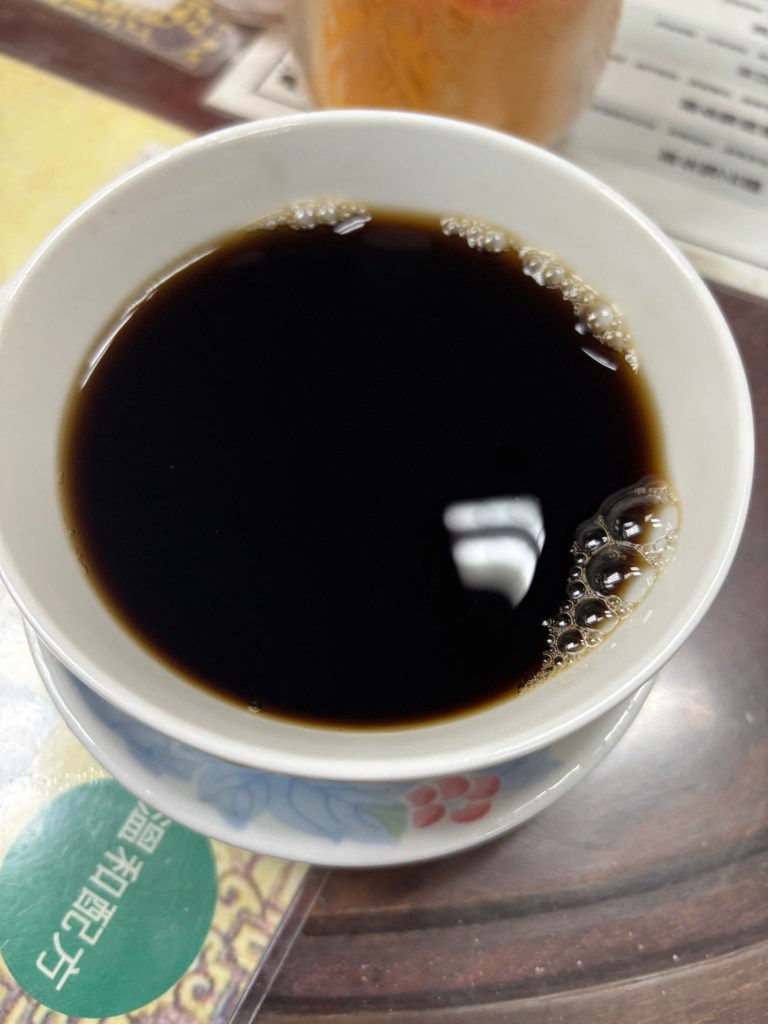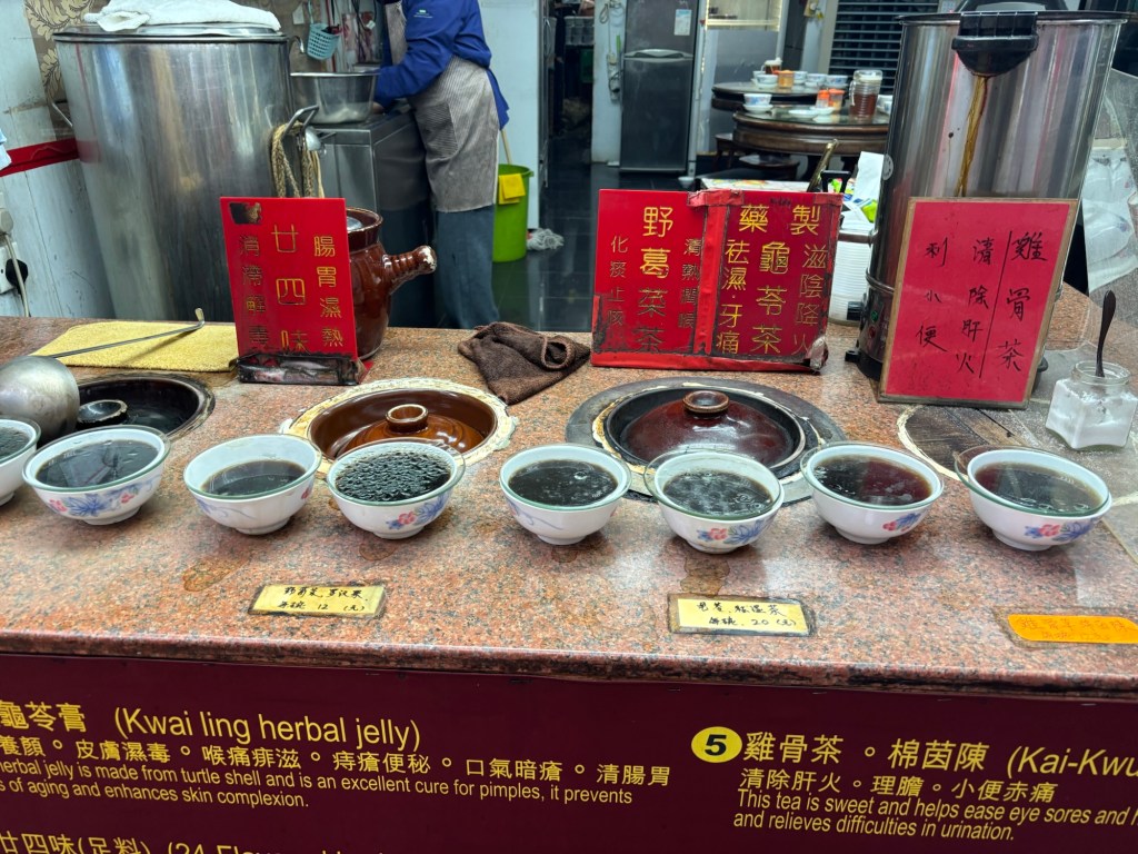 We left the municipal building and walked to a medicinal tea shop. We passed several in walking the city. They sell prepared tea you can drink there, take home, or tea you can take home and prepare. Additionally they sell something called turtle jelly which is apparently good for folks suffering from acne. Originally made from the bottom shell of the golden coin turtle, most modern day versions are entirely herbal. We did not try the jelly, but did try a brew called 24-flavors tea. It is good for “clearing heat from the body” caused by stress or unhealthy diets. It also fights the heat of inflammation in the body. It looked like black coffee and Steven told us it would be quite bitter, but to me, it tasted like liquid smoke (the cooking additive/flavoring). The majority of our tour companions chose not to finish their cups but Phil and I and a couple of other folks did. I did not particularly like any of the 24 flavors, but figured after all of the walking and eating of different foods over the last couple of weeks, I was inflamed, so might as well take the free medicine.