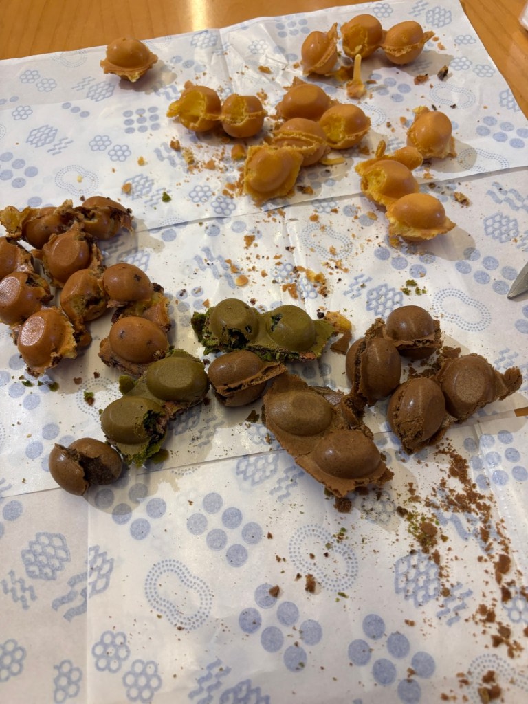 We walked on to our last stop, a Hong Kong bubble waffle (or pancake) stand located in Central Market, a small, modern mall. I’d read about the waffles as well and was keen to try them. As a group, we voted on the flavors we wanted to try. We went with 1 traditional, which has a mild, vanilla custard flavor,and 3 other flavors: chocolate banana, matcha with red bean, and earl grey. Traditional was darn tasty with mild sweetness. The chocolate banana (Phil’s choice) was very good and not too sweet, the matcha red bean was very matcha-y, and the Earl Grey was actually quite nice. Not quite as strong as the matcha, with a complimenting, subtle sweetness.