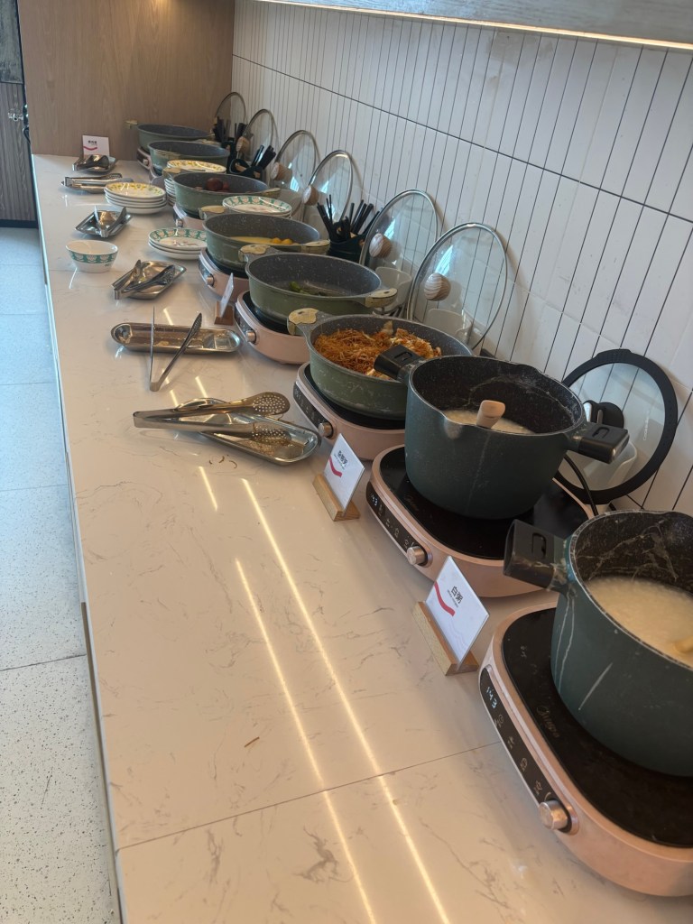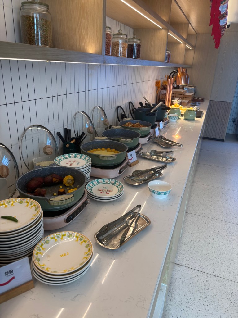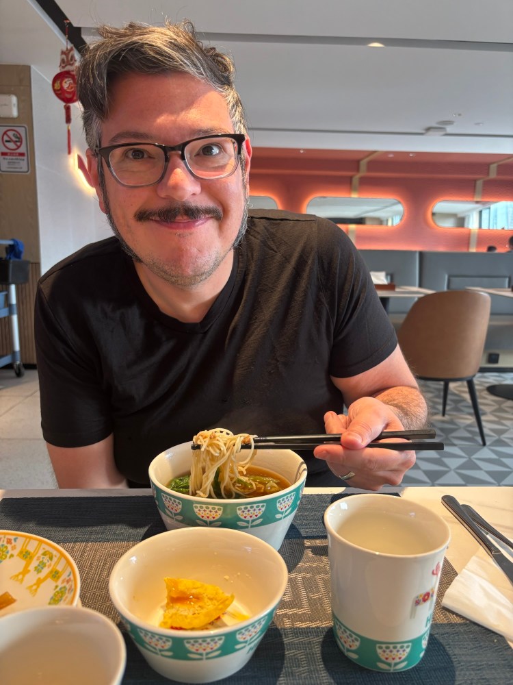 Since we are traveling on a budget, we wanted to take full advantage of the included breakfast. And what a breakfast it was. They had a window to the little kitchen where a woman was making steaming bowls of noodles to order (Phil is enjoying his below). This noodle soup with a little meat and veg is a very common Chinese breakfast. There were also dim sum baskets of various sweet and savory buns, plus a large buffet of vegetables, usually cooked with a little meat; hard boiled eggs, sweet potatoes, dumplings, congee (a hot, typically savory, rice porridge) and a few western-style sweet treats, bread, and toaster.