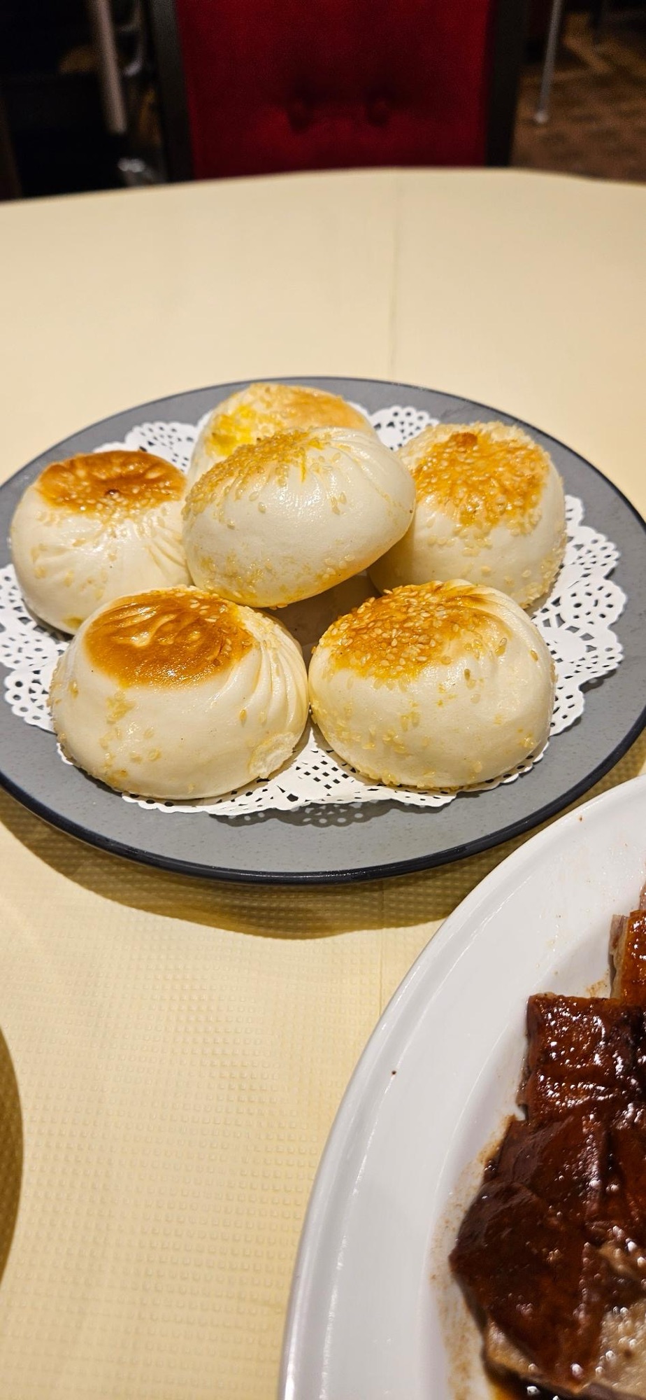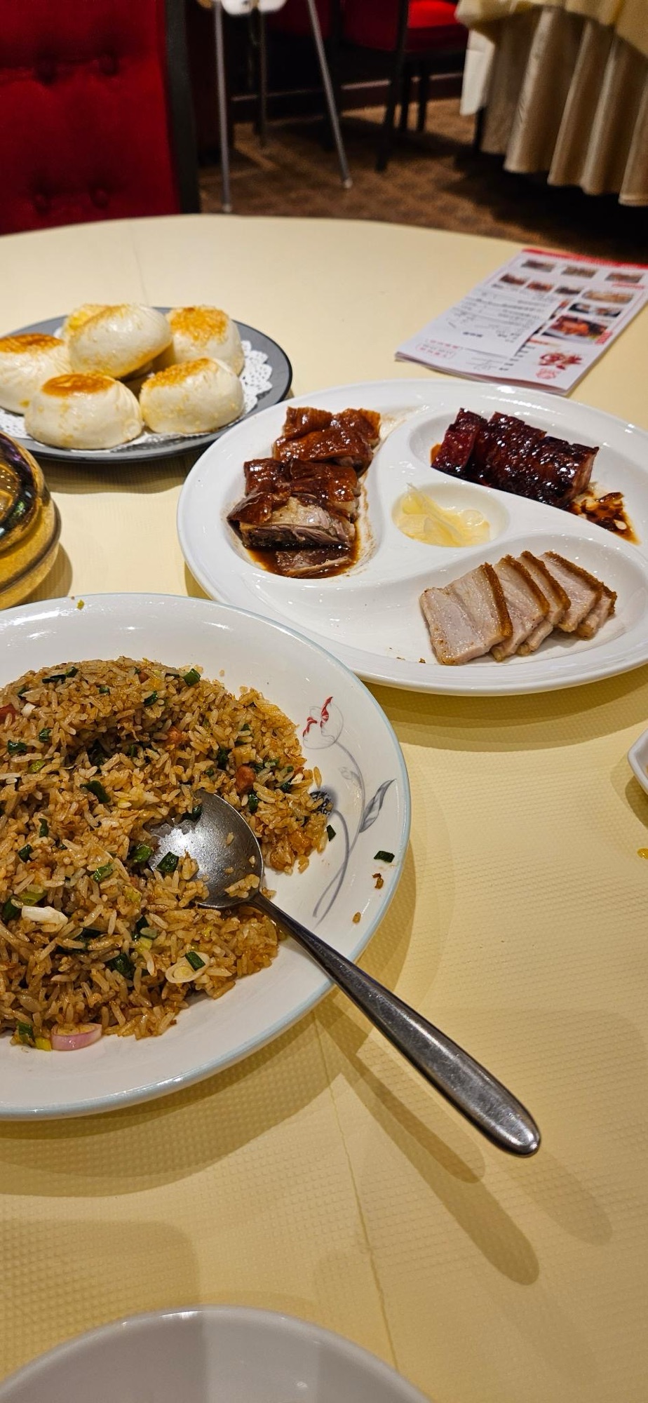 We had a platter of meats: roast goose, pork belly, and roast pork, fried rice, bok choy, steamed buns with BBQ pork, and some other buns than were browned and crispy on each side and had some kind of savory filling. It didn’t matter what the filling was because the bun itself was insanely delicious. Buttery and soft with the crisped parts. They tasted a lot like the salt bread that we had in Korea.