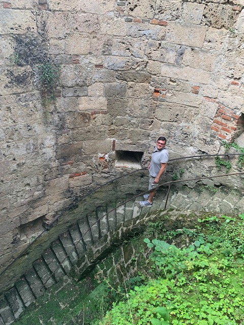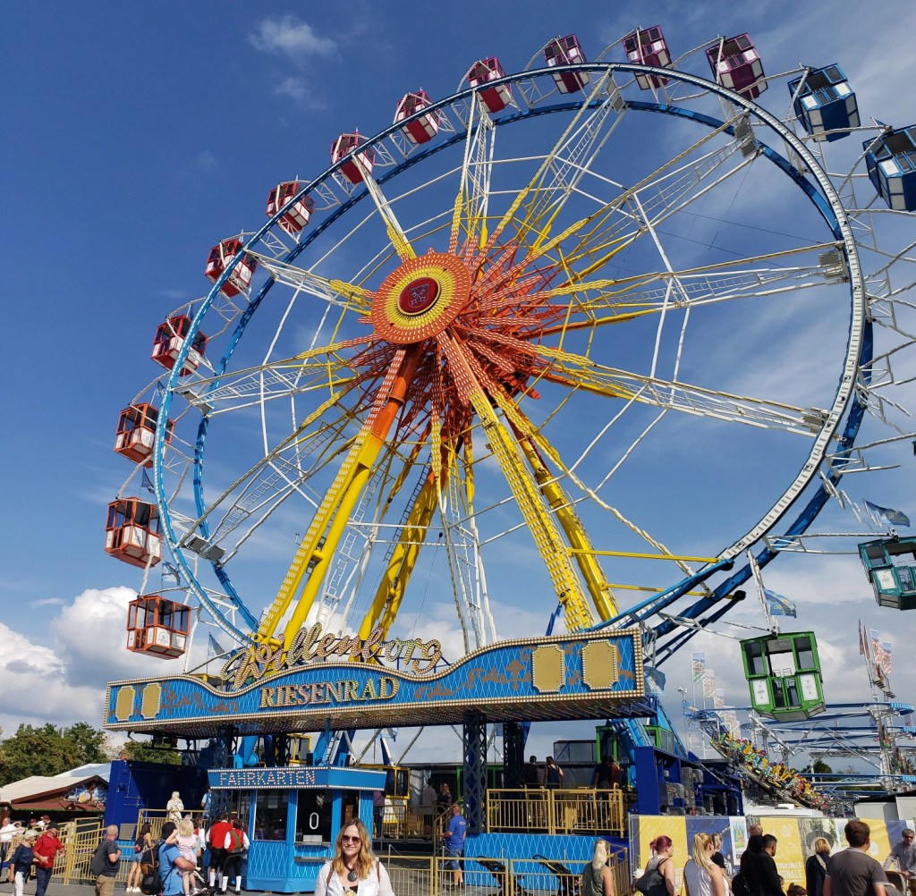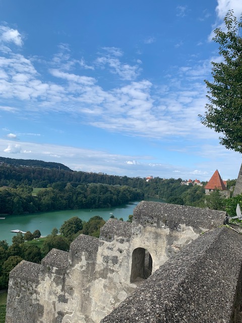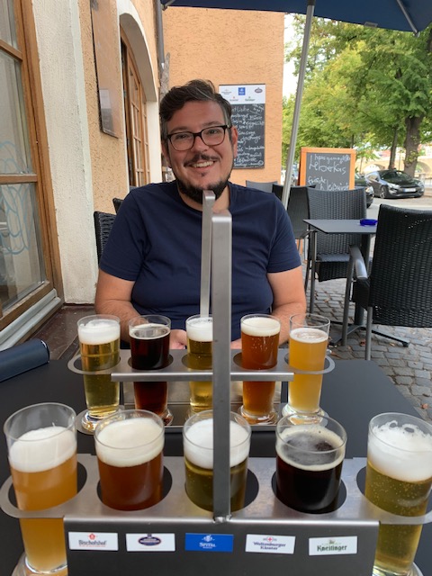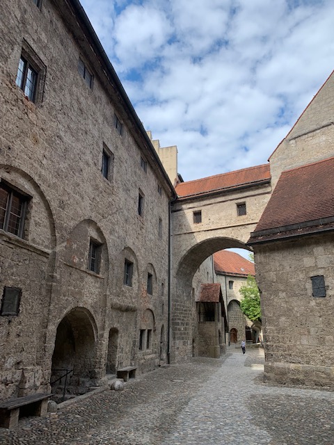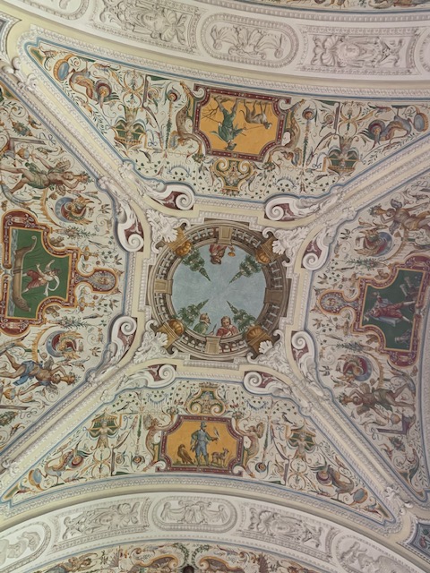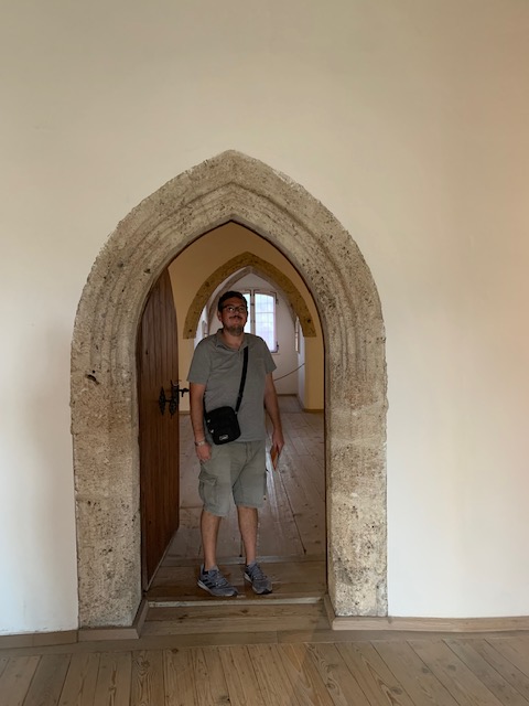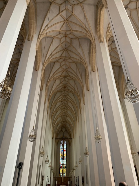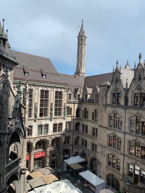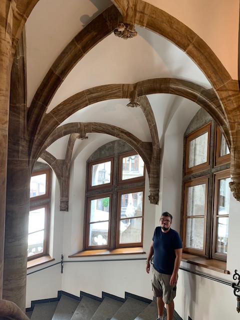 After we left the Synagouge, we met back up with the Dianas for a lunch of tasty cheeseburgers, then stopped by the municipal library to see their famous tower of books. We waited in the long line for about 15 minutes before Phil popped into the side entrance (so library visitors don’t have to wait in the long, tourist line) and reported that the tower was right inside and one could get quite close without waiting. Phil and Diana made their way in to check out the tower and the library. After waiting 10 more minutes, Utkarsh and I did the same.