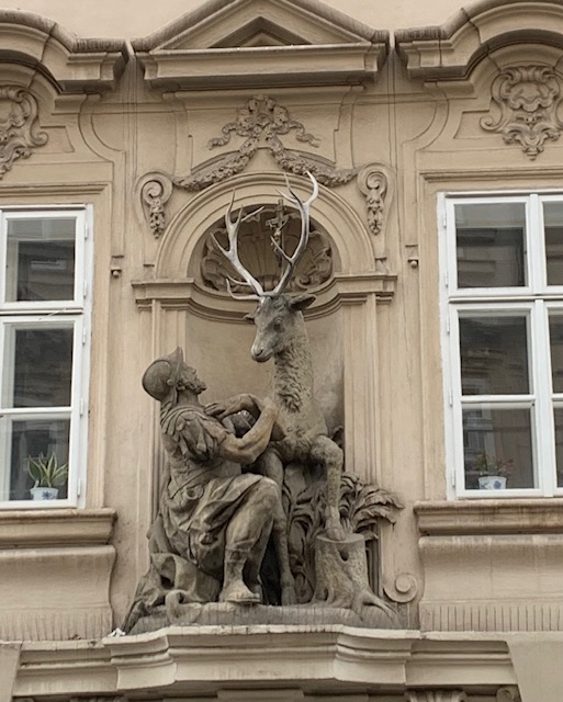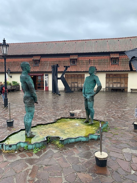 We walked on, refueled, passing an architectural sculpture of what appeared to be a man proposing marriage to a deer, and the famous urinating sculptures by Prague’s bad boy artist, David Černý. The two male figures containing electronic mechanisms within that allow their hips to swivel and penises rise and lower to disperse streams of water, appear to be, quite literally, having a pissing contest.