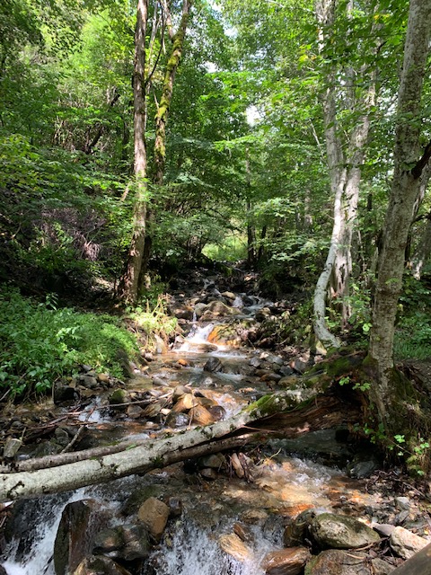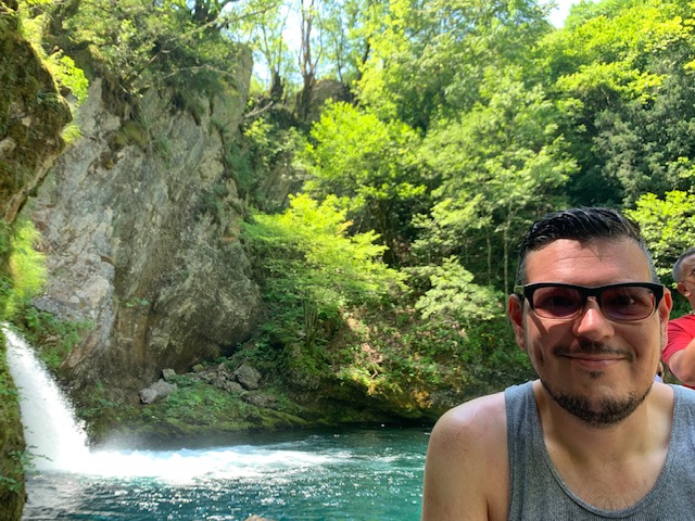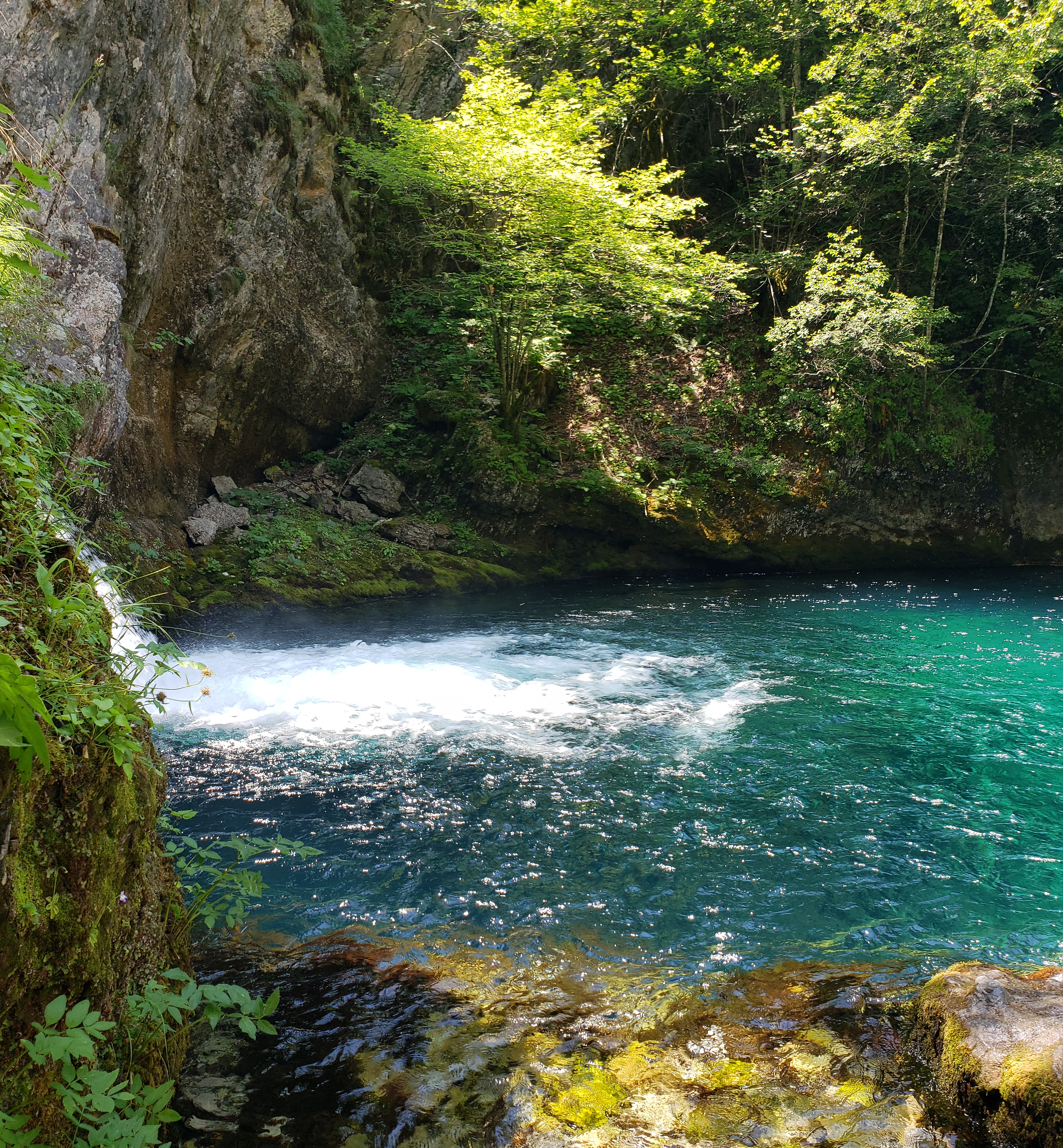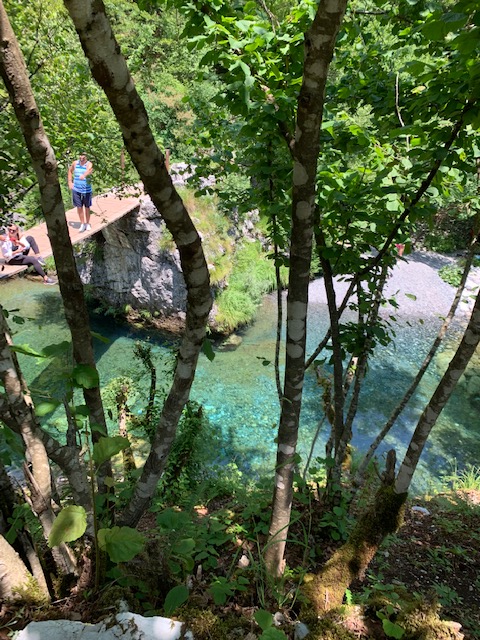 At that moment, we saw a group of hikers coming down from the direction of the fellow had pointed and we asked them how close we were. “Three minutes” he said. That sounded doable so we walked up and then back down to the Blue Eye. It was beautiful and blue and clear and freezing cold. Some folks lounged near the edge of the water in their bathing suits but only a very few braved the icy waters. After sitting along the water’s edge, taking a few photos, and refilling our water bottles with the cold, fresh, mountain water, we headed back down to meet back up with the bus.