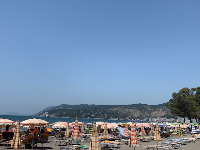 Our first beach day in Shëngjin was spent a short five minute walk from our accommodations (let’s talk more about Albania accommodations later because they are worth mentioning). We set up in beach chairs equidistant from the sea and the beach bar. We had a large umbrella with a table around it to block the sun and hold our drinks. The beach was soft and sandy, the water blue and while not the clearest or most beautiful we’ve seen, it was warm and inviting. The water was so shallow near the shore, one could walk out nearly fifty yards and still touch the sea floor. We swam and lounged and drank the whole afternoon, grabbing a couple of pizzas on the way home for dinner.