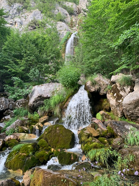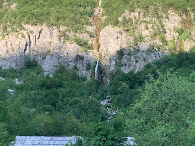 Up we went, climbing and sweating. Before too long, we felt the temperature drop as we neared the mountain falls. They were lovely and well worth the climb. As we were there not long before sunset, there were only a few other folks and pretty soon, it was just the two of us. It was a great way to spend our first few hours in Theth, getting out into nature and breathing in the fresh air (respira al aire). The green hills and rustic stone walls of the area reminded me of our beloved Asturias.