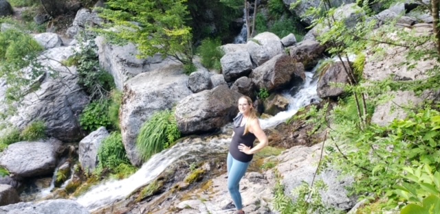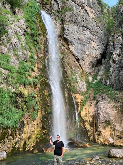 The mother of the family running the guesthouse, Anna, told Phil the two must-sees in Theth were the Blue Eye of Theth (a natrual blue pool in the mountains-which we had already planned to visit) and a nearby waterfall. She told him the waterfall was only about a 20 minute walk from the guesthouse. We decided it was still early enough in the evening for us to check it out, so off we went. We walked along the river, following red signs pointing the way to the falls. We eventually saw the waterfall in the distance but were confused as to how to reach it. Soon the trail curved upward and we knew how we would reach it, by climbing up the damn mountain (escalar, escalar). We had already been walking for well over 20 minutes but figured we’d made it this far so might as well keep going.