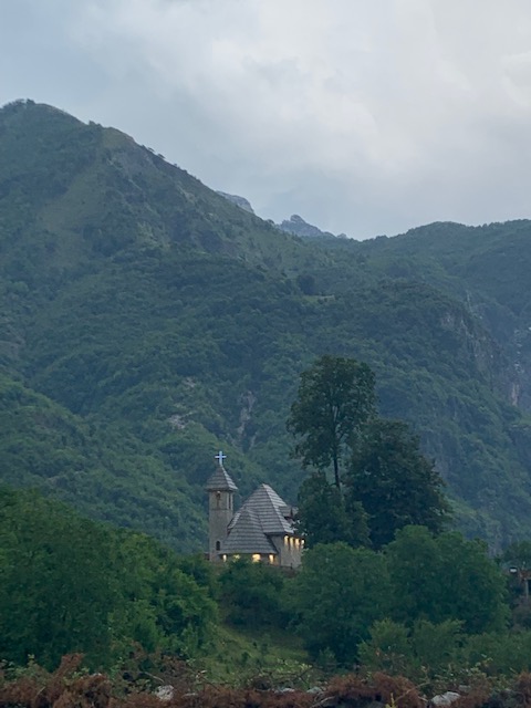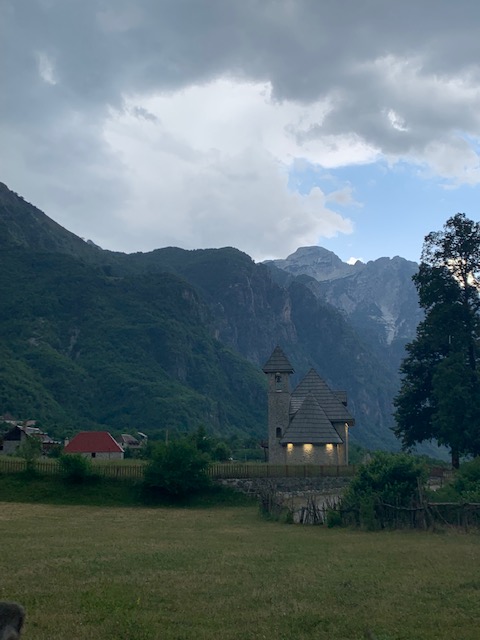 After watching a bit of the performances and grabbing a beer, Phil and I decided to make our way back to the guesthouse as the sky was getting dark and rain looked to be moving in. They’d even started taking the stage down from the festivities. On the way we saw the Kisha e Thethit, the small Cahtolic church in town. It was in the direction of our guesthouse so we decided to take a different route that would take us home, passing in front of the church.