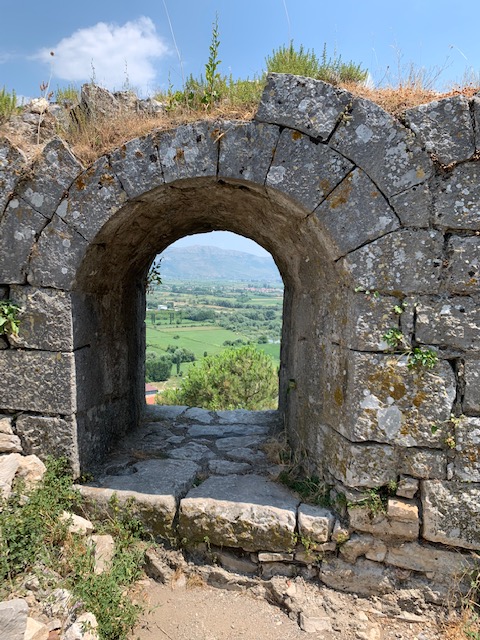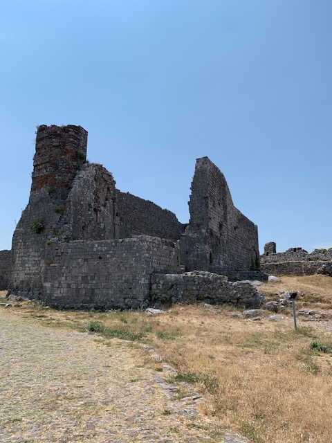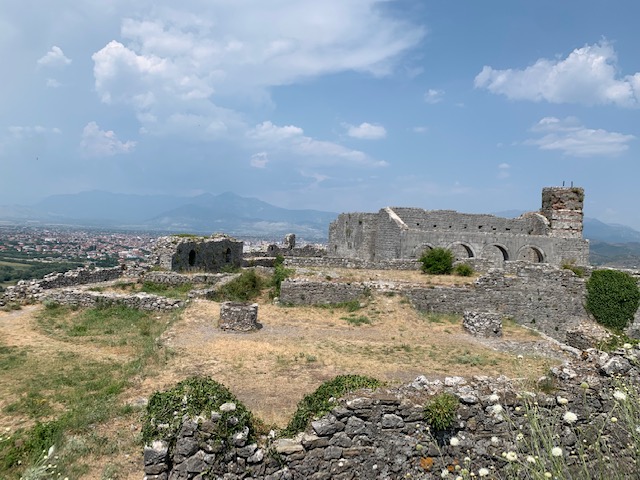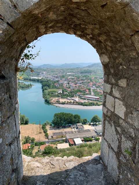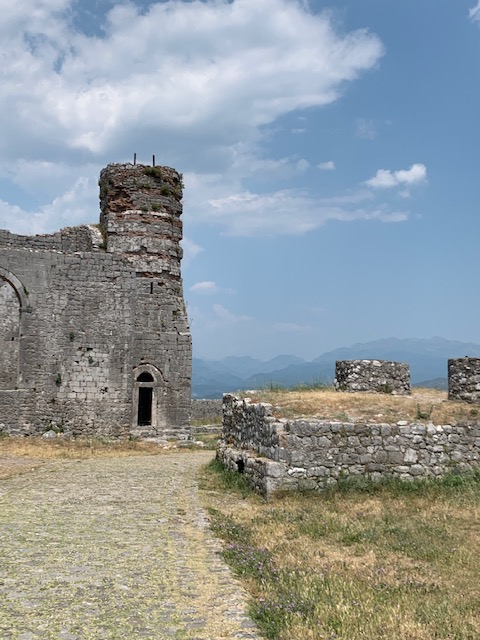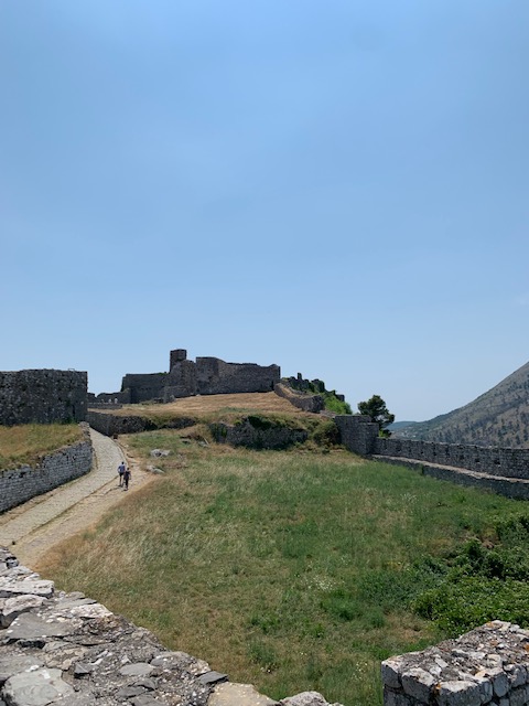 The castle dates back to the Ilyrians in the 4th century BC (Phil writes in more detail about the history in his post). We paid a small entrance fee and climbed up a steep hill paved with well worn stones. The first of several castles we would visit during our time in Albania, Rozafa offered great views and many intact, climbable ramparts. Unlike some of the other castles we visited, there were no security guards or barriers to block access to any part of the castle so we were free to roam where we chose. We often marvel at how in Europe, most historic or scenic sites do not have any fences or safety barriers (only barriers to prevent folks from walking on centuries old mosaics, for example) unlike in the US. It’s kind of refreshing and I suppose a bit dangerous. I guess they trust you to use your head and not jump off the edge of the cliff, wall, ledge etc.