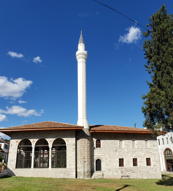 After finishing up at the Halveti Tekke, we walked toward the larger mosque, still in use. I started to cover my hair and the older fellow who was showing us around informed us that Albanian muslims were very liberal and there was no need for me to do so. We took off our shoes and entered the mosque. I think he could tell we were genuinely interested in the history and architecture because he asked us if we wanted to climb the stairs to the minerette. The minerrette is where, in most mosques nowadays in our limited experience, speakers play the five times daily prayers of muslims. At one time, the mosuqe imam climbed the minerette steps to recite the prayers.