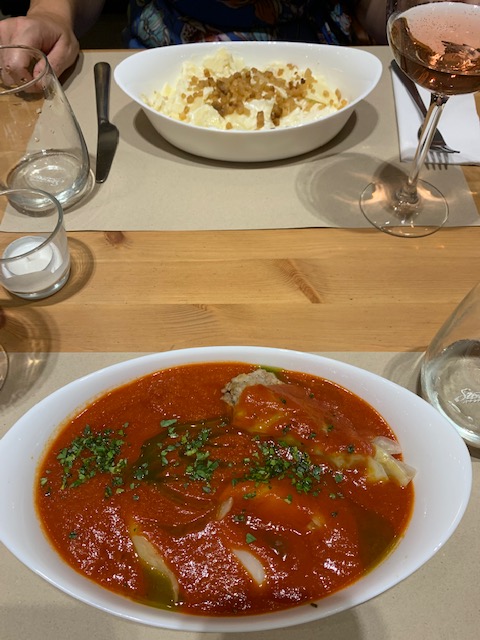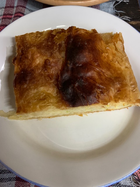 Ardit, Elvis explained to us, had graduated from culinary school in Italy and was now running the restaurant’s kitchen, with a little help from his mother, who made a couple of local specialties. For our first meal, we ordered the recommended lake trout along with a Greek salad. Platter after platter emerged from the kitchen and we were treated to a real feast, including several dishes we hadn’t ordered. We enjoyed the lake trout, pasta with cheese and olive oil, bread topped with cheese that had a similar consistency to cast iron skillet corn bread but was not made with corn meal, and a platter of fried fish roe cakes. Everything was delicious.