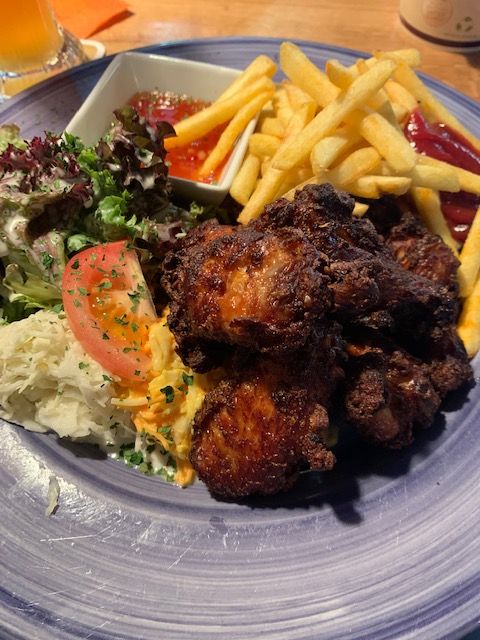 The next day we were off the Black Forrest and the town of Baden-Baden. We decided to stop in the small town of Bühl on the way for lunch as we planned to do a bit of a hike through the Black Forrest and figured we needed our energy for the trek. We found a cool little pub, or bierhaus, with dark wooden booths and friendly service. For some reason, the chicken wings on the menu were really calling to me. Well, actually I know the reason, it is because I hate having to choose between a salad or fries. I want salad AND fries and the chicken wings came with both. I know it’s not a particularly German order but sometimes bar food is bar food, right?