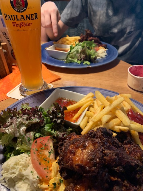 I am so happy I ordered the wings because they were the best chicken wings I have ever had. I don’t know if it was a fried then baked situation or twice fried (there was definitely a two-step process at play is all I’m saying) or what but they were delicious. Super crispy and juicy and extremely well seasoned. Katie, who does not particularly care for chicken wings agreed, they were damn good. I washed them down with a Paulaner beer, which is a particular favorite of mine made even better because I was in Germany.