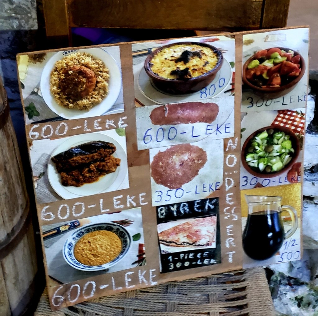 There were six, two person tables, set up in what looked like Lili’s home patio (I’m pretty sure that was exactly what the situation was). Phil and I sat beside a young Irish couple, and Lili excitedly described the menu options to us (with the menu board pictured below) and the others gathered for an early dinner. We ordered the fergesa, which is a warm dish of tomato sauce, cheese, and spices served with bread for dipping, along with the qofte (meatball), Greek salad, and byrek (Albanian stuffed filo pastry) with cheese and spinach. We paired the meal with a pitcher of homemade wine made by Lili’s father. All of the food was prepared by his wife whom he would occasionally disappear to talk to but who we never actually saw during our time there.