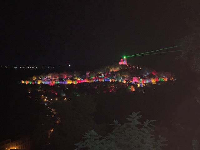 We enjoyed a slow walk back to the rental where we relaxed for a bit. Later we enjoyed dinner at a traditional Bulgarian restaurant right across the street from our apartment. After dinner, we headed back to old town to catch the light show. We could not get a ticket but found a nice spot, atop a large stone wall, to see the show. It was hard to capture via photo the grandiosity of the light show but it was truly something to see. They turn off the lights in that area of town to help the lights from across the river at the fortress really pop.