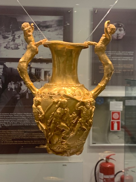 Another great museum in Plovdiv is the The Regional Archaeological Museum. I was actually a little reluctant to go. After having seen a lot of ancient pottery, ruins, and artifacts this summer, I was almost archaeology-ed out. Kind of like seeing a lot of Catholic churches, sometimes you need a little break. I am, however, very glad we decided to go to the museum. They had a unique exhibit of The Panagyuristhe Gold Treasure, a luxurious table set consisting of nine gold vessels of different shapes. Made at the beginning of the 3rd century BC of 23-karat gold; they were found by three brothers (The Deikovi Brothers) in 1949. The pieces were really unusual and so detailed.